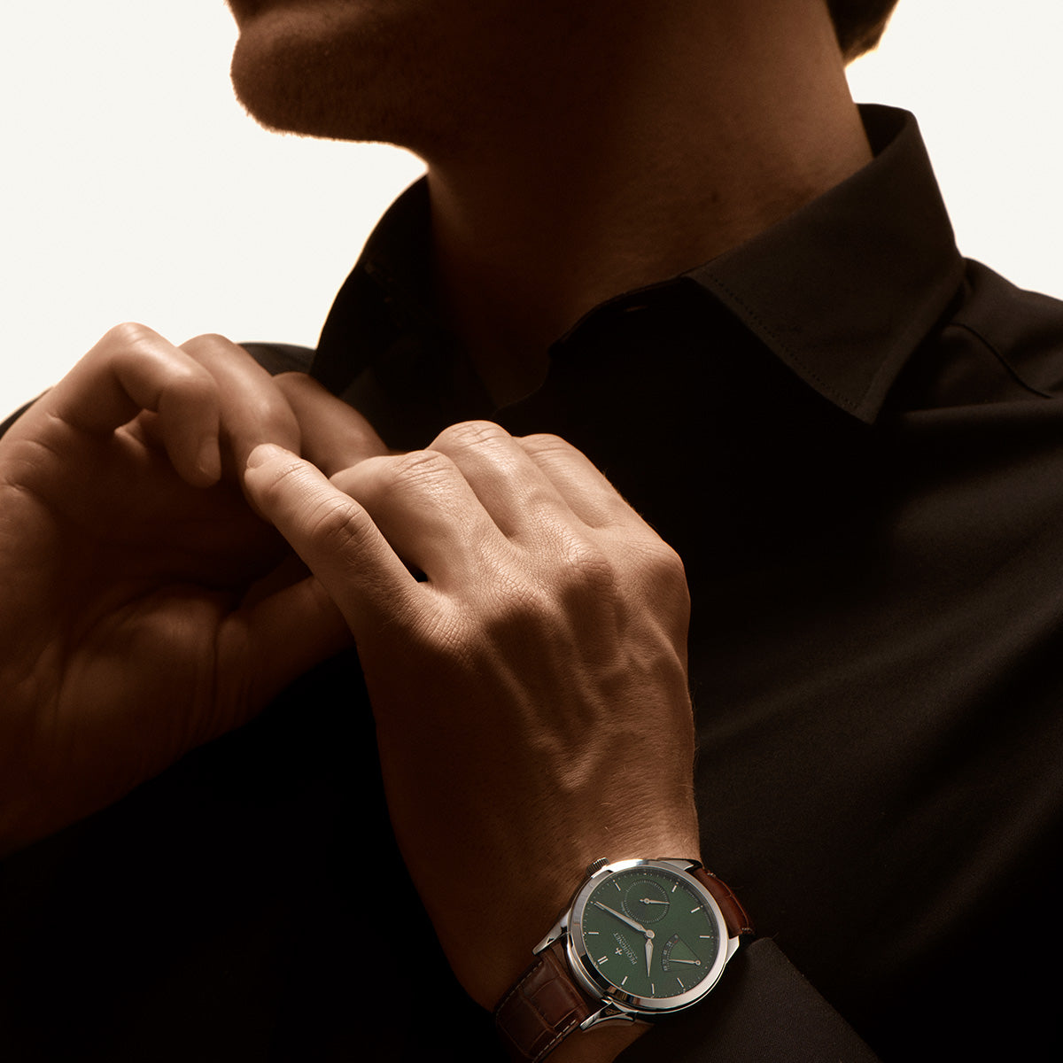The Royale Origine, for lovers of fine craftsmanship. A timepiece that gets straight to the point with its round case in polished steel or rose gold, featuring a silver, black, blue, or green dial that reflects sunlight.