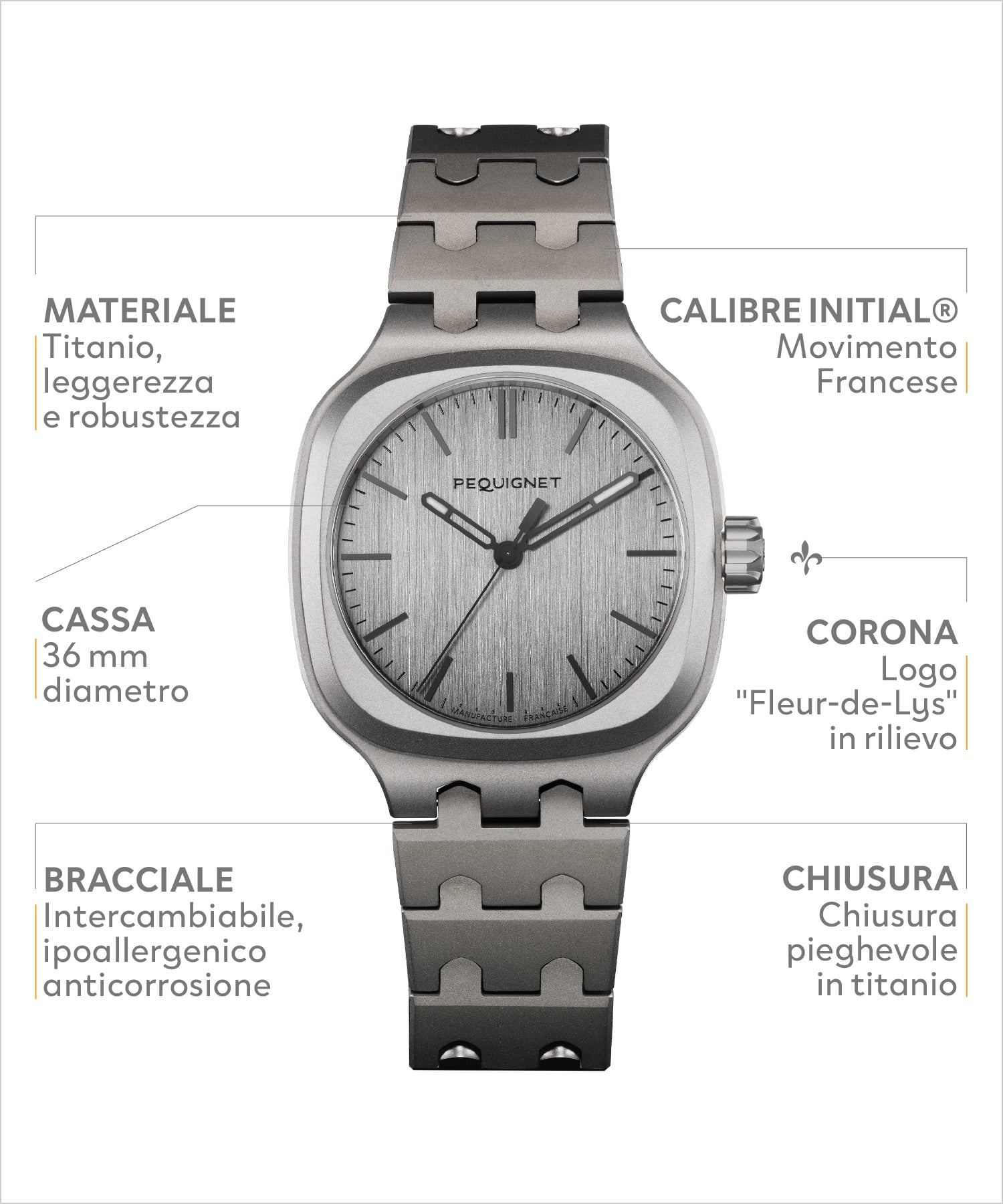 È animato dal Calibre Initial®, il terzo movimento di Manifattura concepito da Pequignet. Per cura del dettaglio, quest'ultimo è stato trattato specificamente al Rutenio per avvicinarsi il più possibile al colore del titanio.