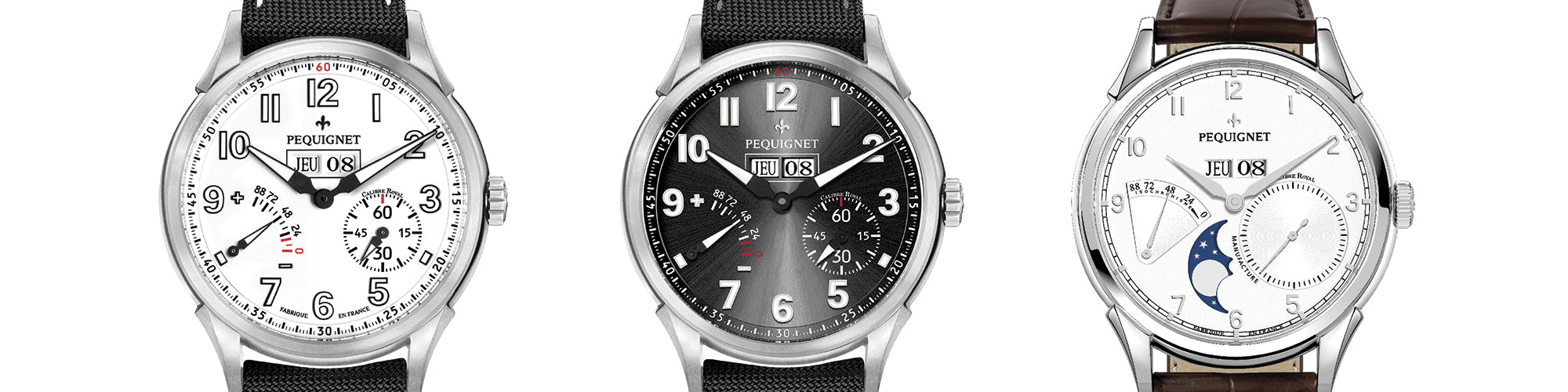 Elégantes et raffinées, les montres de la collection Royale sont équipées de deux mouvements français conçus et développés par la Manufacture Pequignet en France, le Calibre Royal®