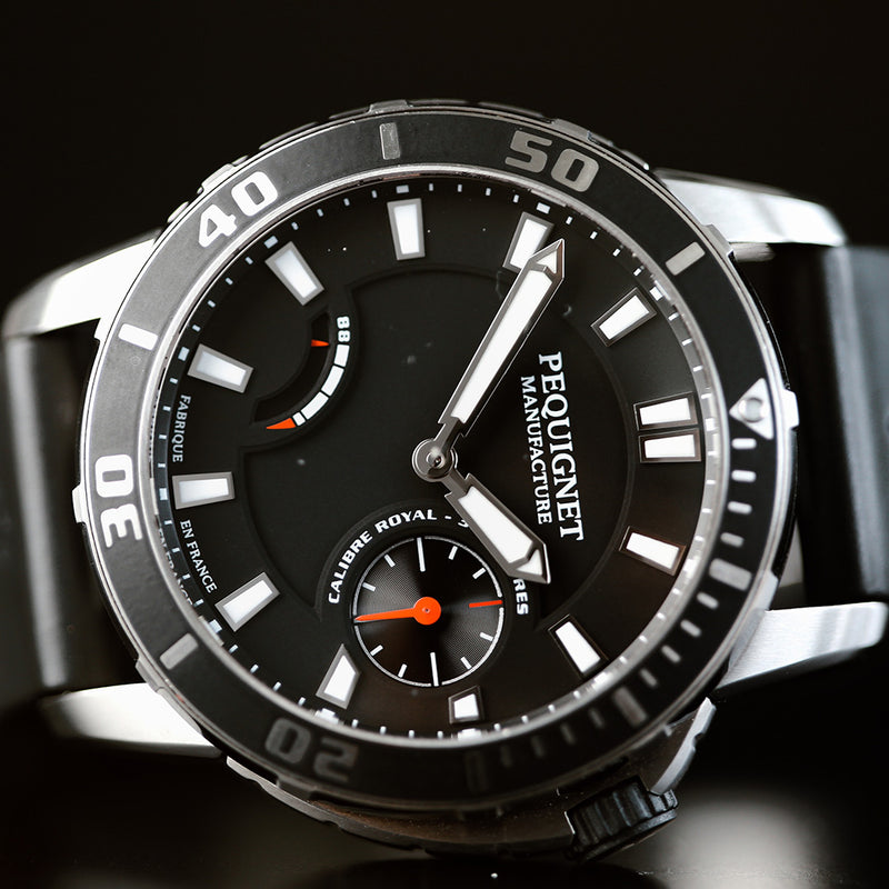 Dotato del movimento Calibre Royal®, di manifattura Pequignet, l'Extrême 300 è un orologio dalla resistenza comprovata. Tutte le qualità di questo calibro eccezionale vengono messe a frutto in questo modello sportivo la cui massa oscillante e il grande bilanciere con viti di compensazione sono straordinariamente precisi. Con le sue 88 ore di riserva di carica indicate a 8 ore e la sua resistenza all'acqua fino a 30 ATM, l'Extrême 300 accompagnerà i più audaci sul fondo del mare. Dotato di ghiera girevole unidirezionale brevettata sovrastampata con gomma vulcanizzata Vulcamix®, è adatto a tutti gli usi. La sua corona brevettata a un quarto di giro consente un avvitamento semplificato e una capsula Bilight® LumiNova® posizionata a ore 12 offre una perfetta leggibilità in ogni momento. Chi indossa un Extrême 300 può assicurarsi un tempo perfetto grazie ai piccoli secondi indicati a ore 3.®