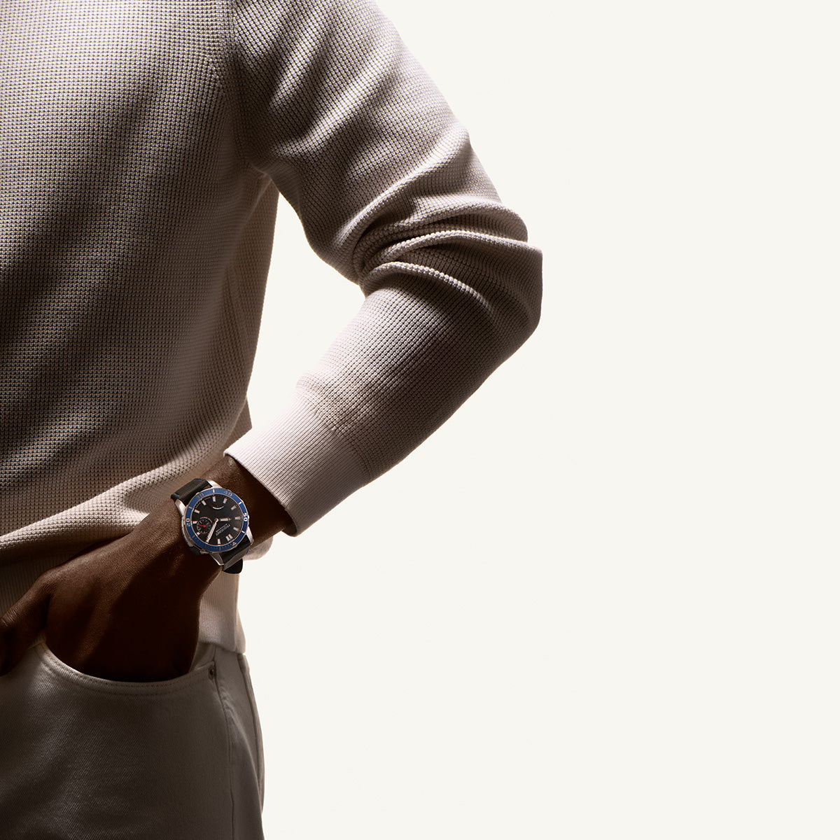 L'Extrême 300, con il suo aspetto sportivo, nasconde in realtà la sua vera ambizione: indicare sempre l'ora esatta. Ciò è ottenuto grazie al quadrante multilivello dotato di due grandi lancette e di un indice LumiNova®.