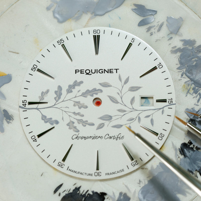Al centro di questo pezzo unico, il quadrante realizzato in pittura in miniatura dall’artista Philippe Jacquin-Ravot rappresenta due rami intrecciati: la quercia, forza della Francia, e il ciliegio, eleganza del Giappone. Questa decorazione, dove l’Oriente incontra l’Occidente al centro del quadrante, illustra un’amicizia franco-giapponese costantemente rinnovata.