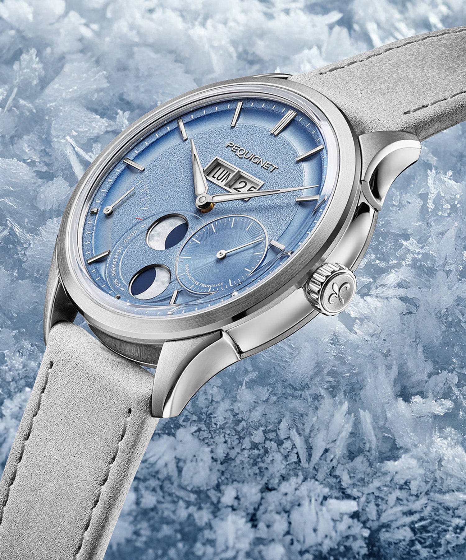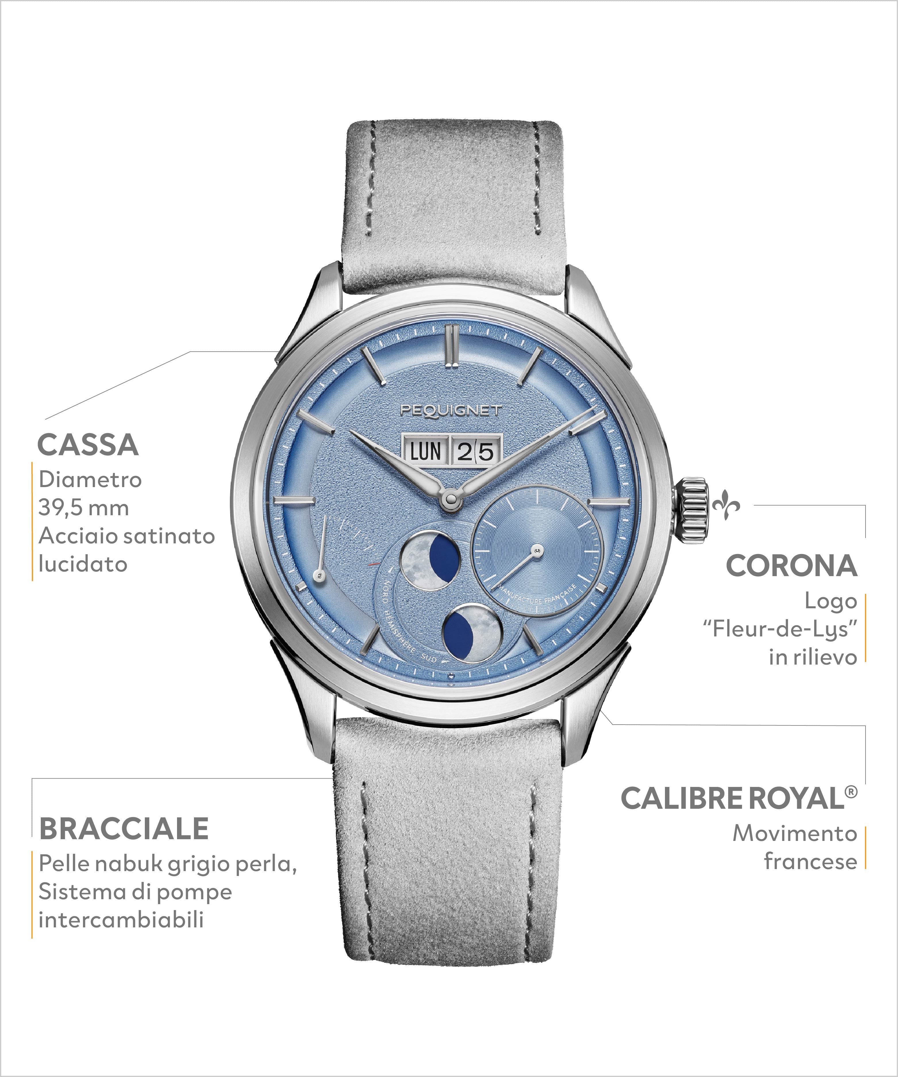 Il colore blu ghiaccio valorizza la texture del quadrante: mette in risalto la superficie granulata, le scanalature sabbiate e il piccolo secondi zigrinato a ore 3:30. Esalta ulteriormente le diverse complicazioni della Royale Paris: la grande data, la riserva di carica e la fase lunare. Quest’ultima è mostrata in due finestrelle, offrendo una visualizzazione realistica degli emisferi Nord e Sud.