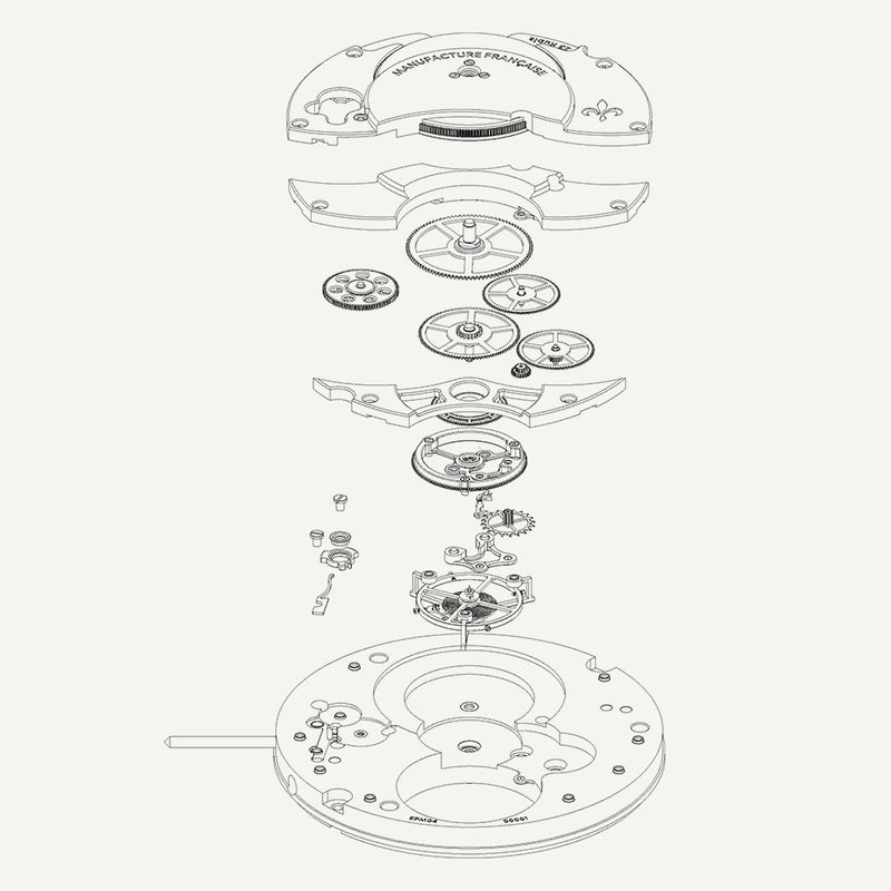 Le Calibre Initial® a quant à lui été conçu pour animer la collection Attitude de la Maison Pequignet. Disposant de deux brevets internationaux, dont l’un pour son système de saut de date semi-instantanée, ce nouveau mouvement est entièrement constitué de composants produits dans un rayon de 80km autour de Morteau ; 72% sont d’origine française, le reste provenant d’un autre pays bien connu des horlogers, la Suisse. Avec un diamètre de 28,2mm pour une épaisseur totale de 4,2mm, le Calibre Initial® affiche une grande seconde centrale et dispose de 65h de réserve de marche. La forme inédite de denture de son engrenage de remontoir, permet d’en améliorer le rendement et de limiter l’usure de ses composants. Son nouveau système d’entraînement de date breveté permet d’améliorer le temps de passage du disque de date et de procéder au réglage quel que soit la position des aiguilles.