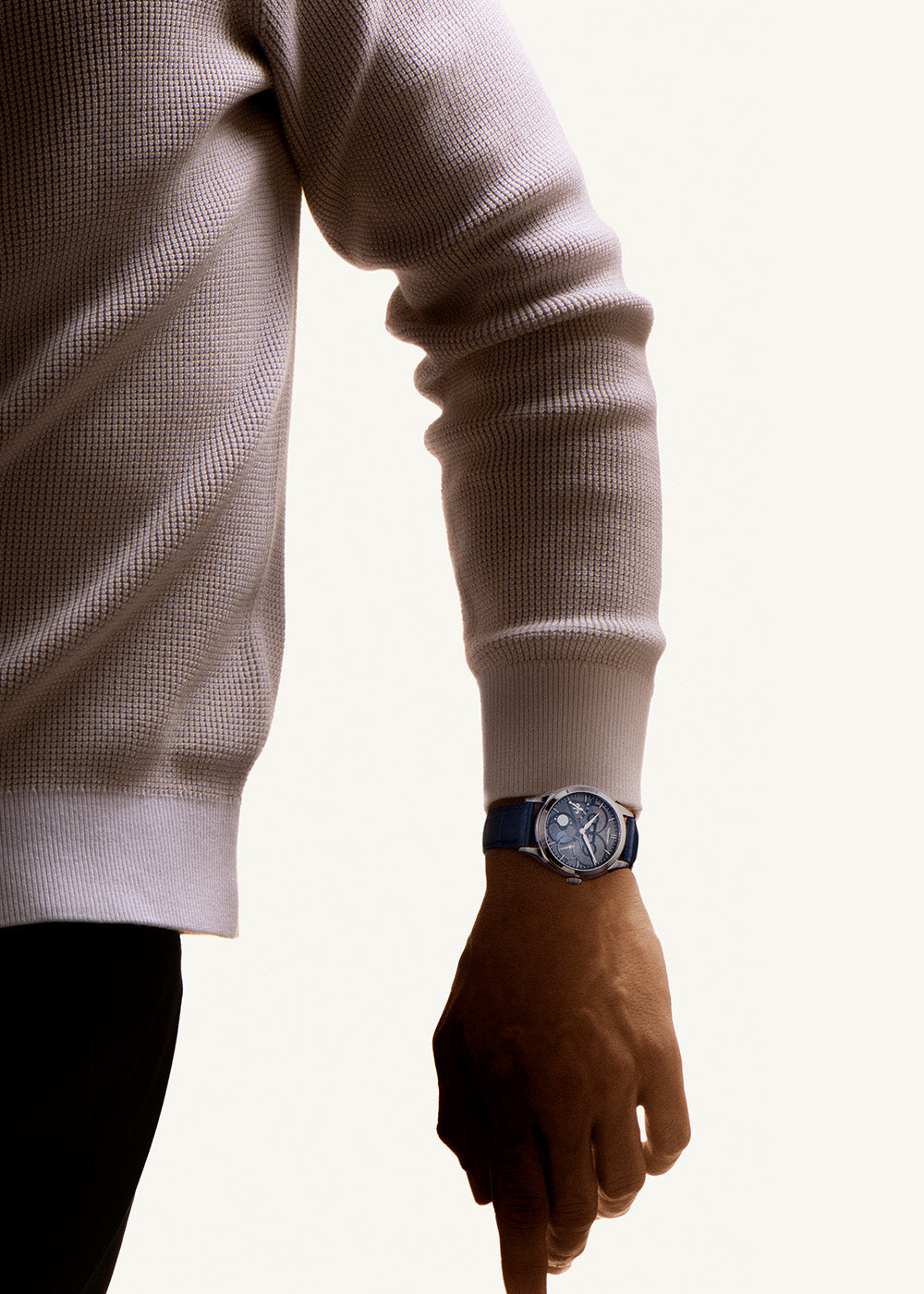 Plongez dans l'élégance intemporelle avec la Royale Saphir « le Temps des Couleurs » qui ne manquera pas de captiver tous les regards. Sa magnifique combinaison de nuances colorées lui donne une aura unique et envoûtante, jusqu’aux composants du cadran (phase de lune et disques date). Incarnation de la haute-horlogerie française, la Royale Saphir allie la noblesse du cadran Saphir avec la beauté de la légendaire date triple saut du Calibre Royal®, premier et unique mécanisme de fabrication française à intégrer ses complications horlogères dans la même platine.
